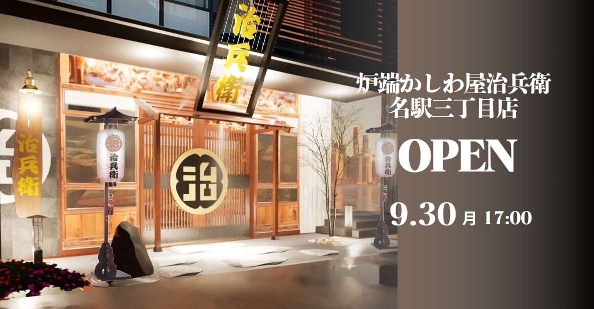 【株式会社カフェヨシノ新業態】1.5m四方の巨大囲炉裏でじっくり焼き上げる炉端居酒屋 『炉端かしわ屋治兵衛』が名駅三丁目に9月30日オープン