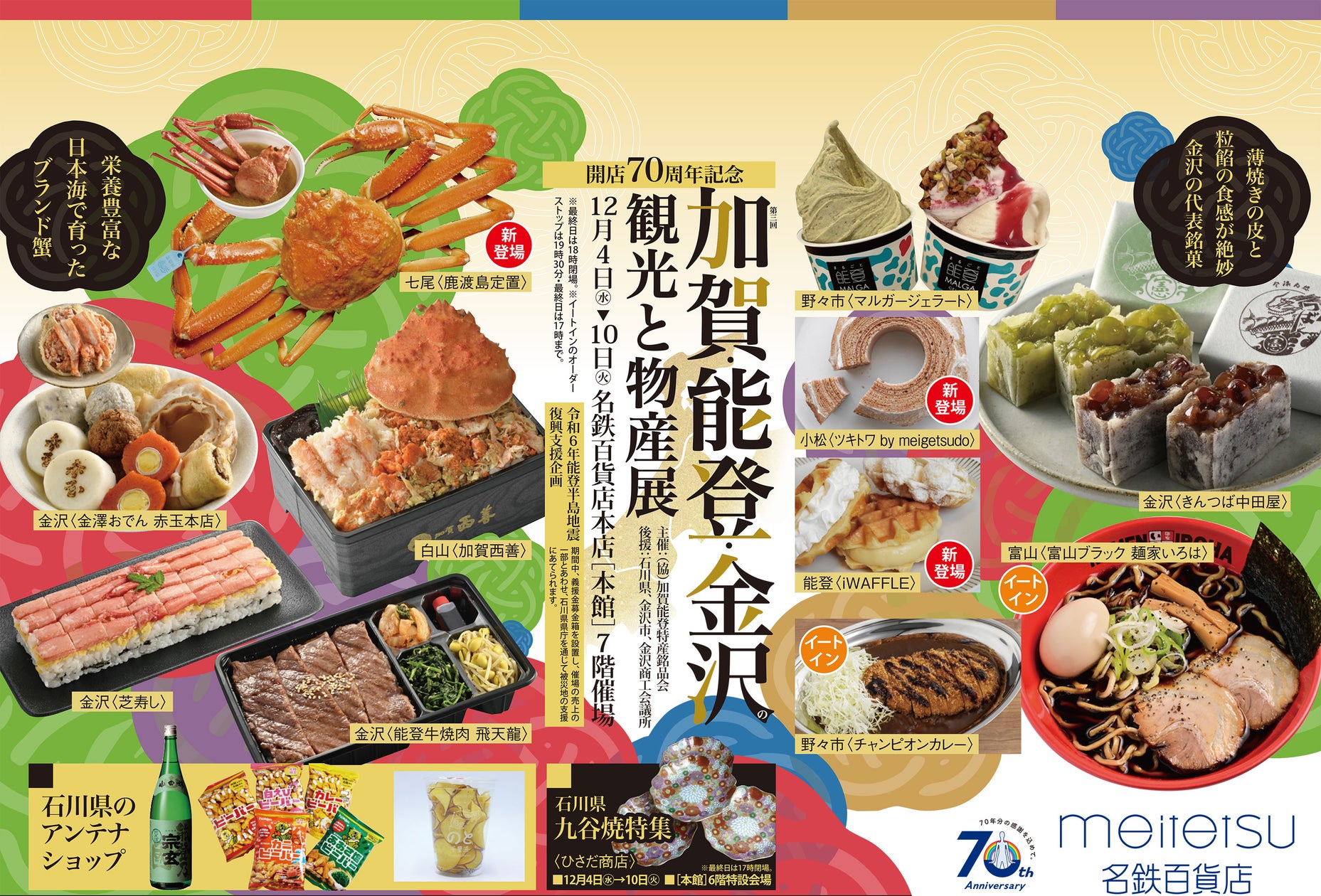 名鉄百貨店では、12月4日から10日にわたり「開店70周年記念 第3回 加賀・能登・金沢の観光と物産展」を開催。日本海の新鮮な海の幸をはじめ、地元の方のみならず観光客にも人気のご当地グルメや伝統の和菓子、進化系スイーツなど石川県各地方の名産品・特産品が名鉄百貨店に大集結します。