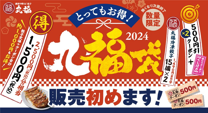 『濃厚中華そば 餃子 丸福』は、2024年12月28日(土)〜2025年1月5日(日)の期間限定で「丸福袋」を販売。「丸福餃子」30個(1,490円相当)と500円クーポン2枚(1,000円分)、合計2,490円相当の商品がセットになって1,500円と超お値打ちな内容となっています。