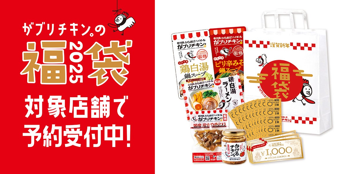 名古屋に本社を構える「がブリチキン。」は、2024年正月に続いて2025年もフードコート/レストラン店舗限定で新年を彩る「新春福袋」を販売。昨年の購入者からの声に応え、2025年はさらにお得に感じてもらえるように内容をアップデートし、税込6,000円「がブリチキン。福袋 福」と税込3,000円の「がブリチキン。福袋 寿」の2種類が登場します。