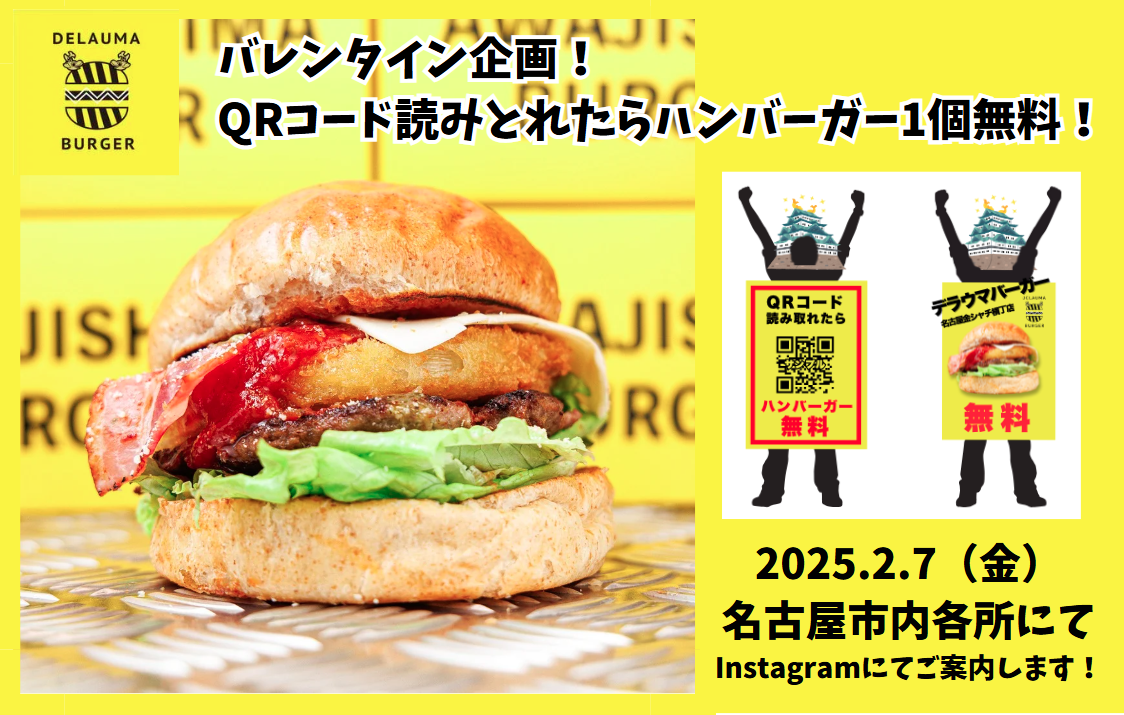 名古屋城金シャチ横丁に店舗を構える「DELAUMA BURGER 名古屋金シャチ横丁店」がバレンタインシーズンにあわせて、特別なプレゼントキャンペーンを2月7日限定で開催。条件を満たした方はグルメバーガーを無料でもらえる太っ腹なイベントが行われます。