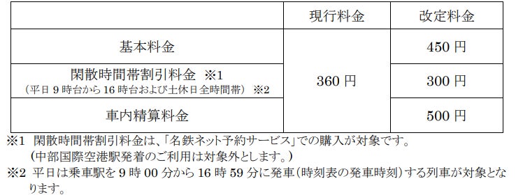 一方、今までは基本料金と同額だった「車内精算料金(特別車に乗車してから支払う特別車両料金)」については、3月16日以降は基本料金よりも50円高い500円に設定。閑散時間帯割引料金と比べると200円も差があることになりますので、乗車前に「名鉄ネット予約サービス」でしっかり購入しておくのがGoodです。