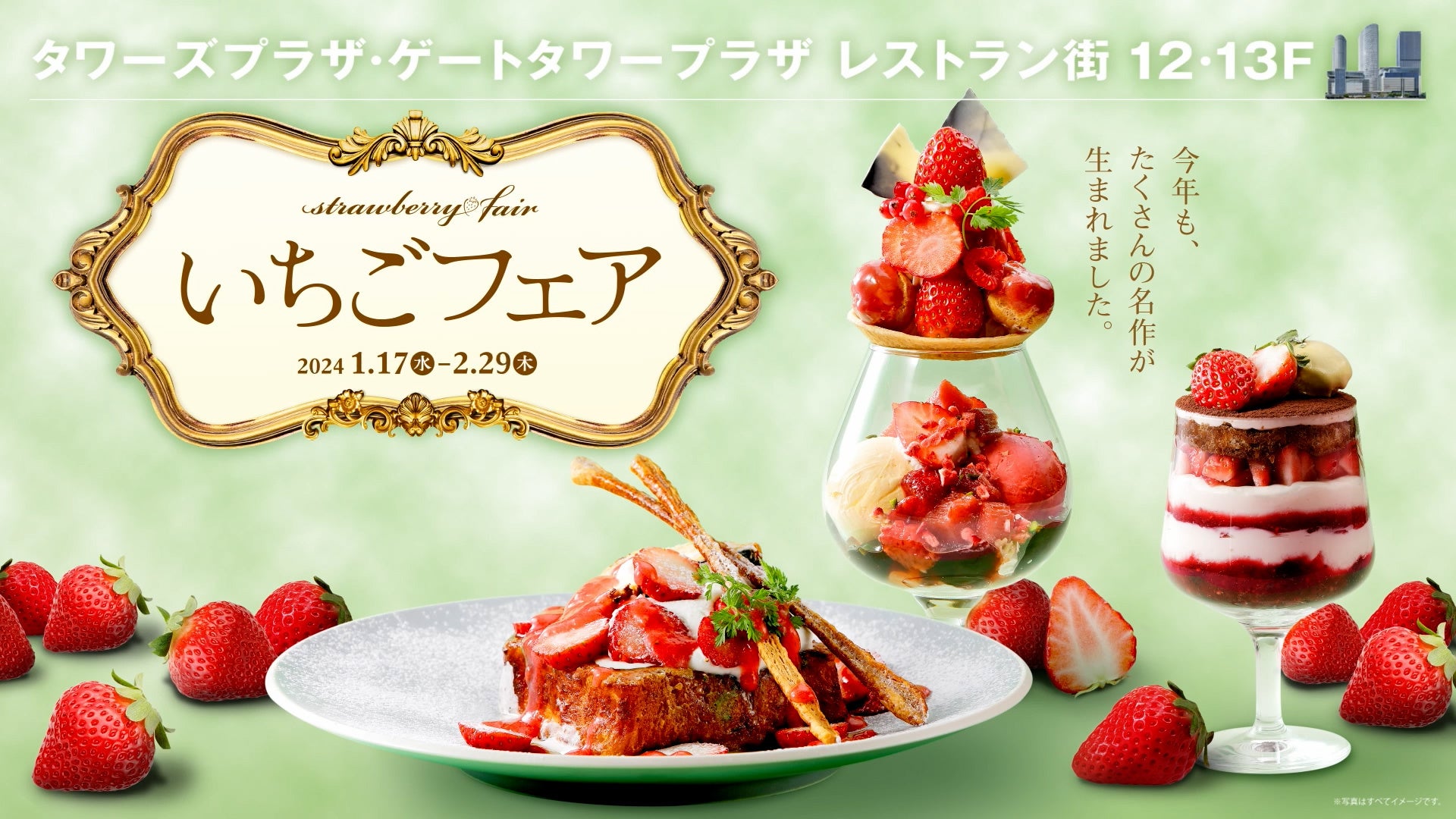 JRセントラルタワーズ「タワーズプラザ レストラン街 」とJRゲートタワー「ゲートタワープラザ レストラン街」では、2024年1月17日(水)より2月29日(木)まで「いちごフェア」が開催中。旬を迎えるいちごの美味しさをたっぷりとを味わえるスイーツが40種類を超えるバリエーションで集結しています。