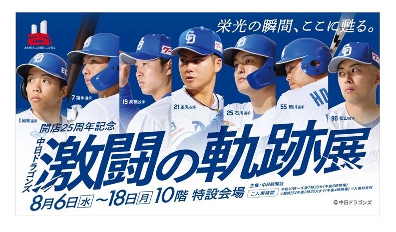 「開店25周年記念 中日ドラゴンズ 激闘の軌跡展」は 2025年8月6日(水)~8月18日(月)まで、ジェイアール名古屋タカシマヤ10階特設会場にて開催。JR名古屋駅コンコースから直結です。