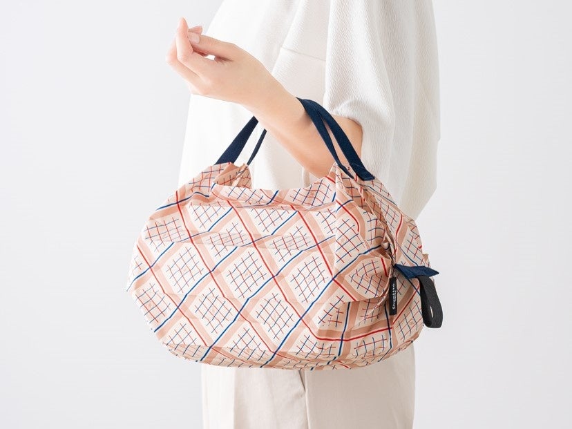 坂角総本舖から今回発売される「Shupatto」は、格子柄の中に坂角総本舖の海老マークを配置したオリジナルデザイン仕様。折りたたみ時は直径約4×6cmととってもコンパクトサイズながら、使う際には500mLペットボトル6本が入るしっかり容量に大変身!ちょっとしたお買い物や、おやつ・お弁当を持ってのおでかけなど、日常の様々なシーンで利用できます。