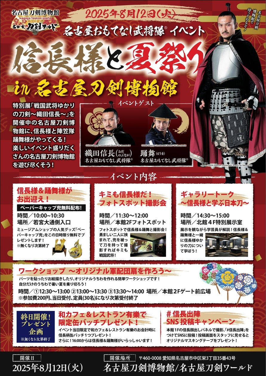 名古屋刀剣博物館「名古屋刀剣ワールド」では、現在開催中の特別展「戦国武将ゆかりの刀剣~織田信長~」にちなんだ夏休みの特別企画「信長様と夏祭りin名古屋刀剣博物館」を2025年8月12日(火)に開催。名古屋おもてなし武将隊の織田信長と陣笠隊の踊舞を招き、一緒に日本刀について学べる楽しいイベントが行われます。
