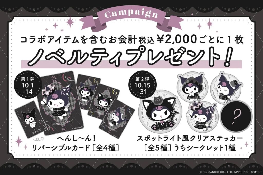 今回の「クロミ」コラボ開催に合わせ、「ハートブレッドアンティーク」「ベンケイ」「パステル」「ピネード」「ねこねこファクトリー 東浦店」の店頭限定でノベルティプレゼントキャンペーンも開催。「クロミ」のコラボ商品・グッズを含む2,000円(税込)ごとのお買い上げで、2025年10月1日(水)からはリバーシブルカード(全4種)、10月15日(水)からはリアステッカーを全(全5種、うちシークレット1種)からランダムで1枚がプレゼントされます。無くなり次第終了なので早めのゲットがおすすめです。(一部取り扱いのない店舗があるためご注意ください)