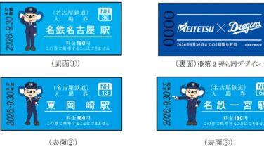 ナゴヤトトピック名鉄の全273駅がドアラとコラボ!「中日ドラゴンズ コラボ硬券入場券」が10月11日より順次発売開始! どこで買える?【まとめ】 名古屋鉄道では、「鉄道の日」である10月14日を記念して中日ドラゴンズとのコラボレーション企画「ドドド!Myベストオーダー」キャンペーンを実施。名鉄の全273駅の駅名と球団公式マスコット「ドアラ」がデザインされた「中日ドラゴンズ コラボ硬券... 2025年10月10日ナゴヤトトピックナゴヤトマトメ